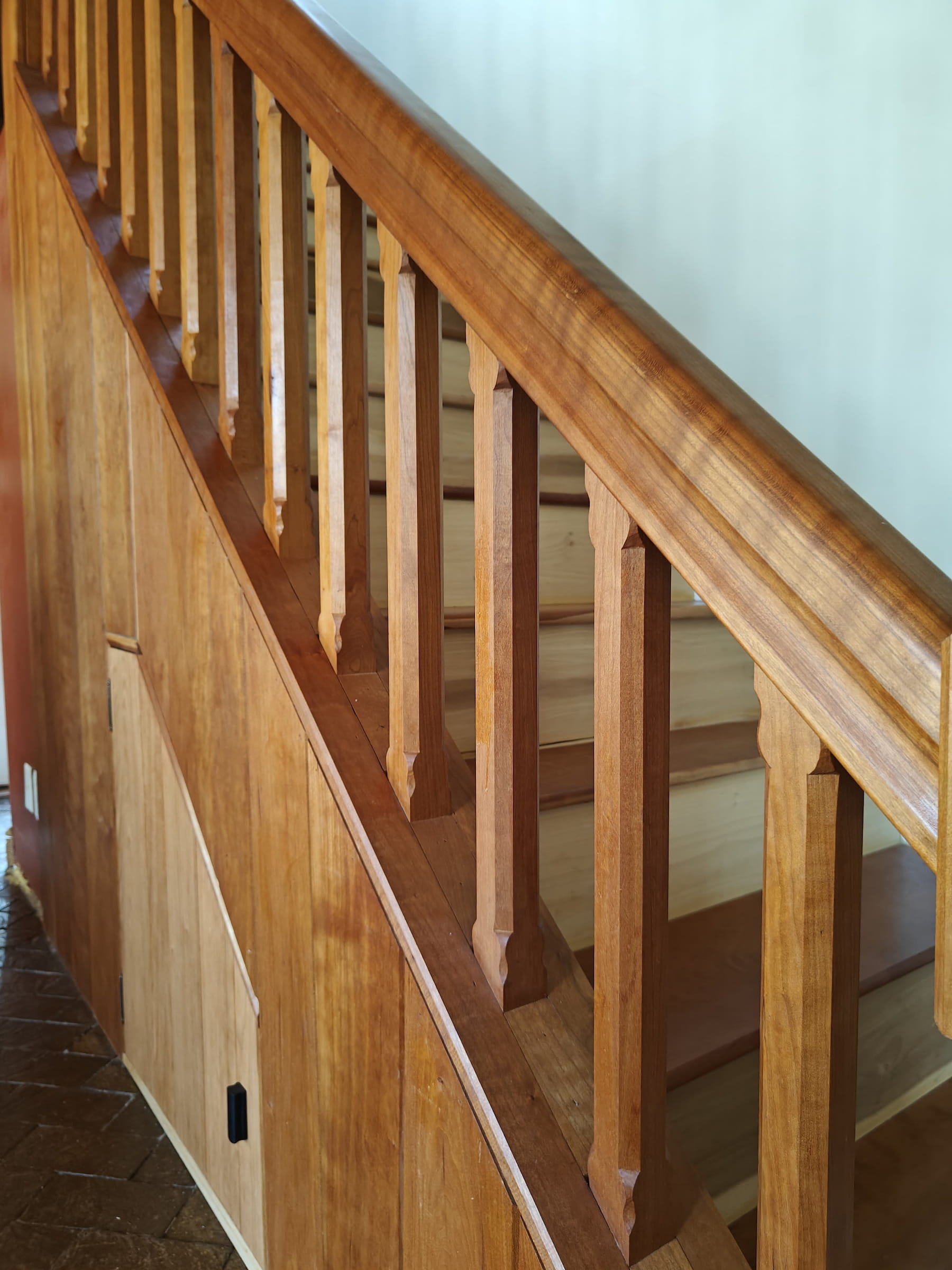 Everything is built and finished in the shop, from rough-sawn lumber to final topcoat. Cases are assembled, painted or oiled, and fully cured before they leave. Your house stays clean and the finish is consistent because it was done flat on a bench, not on a wall.